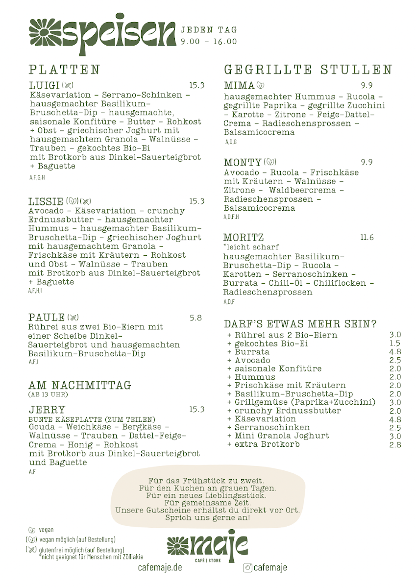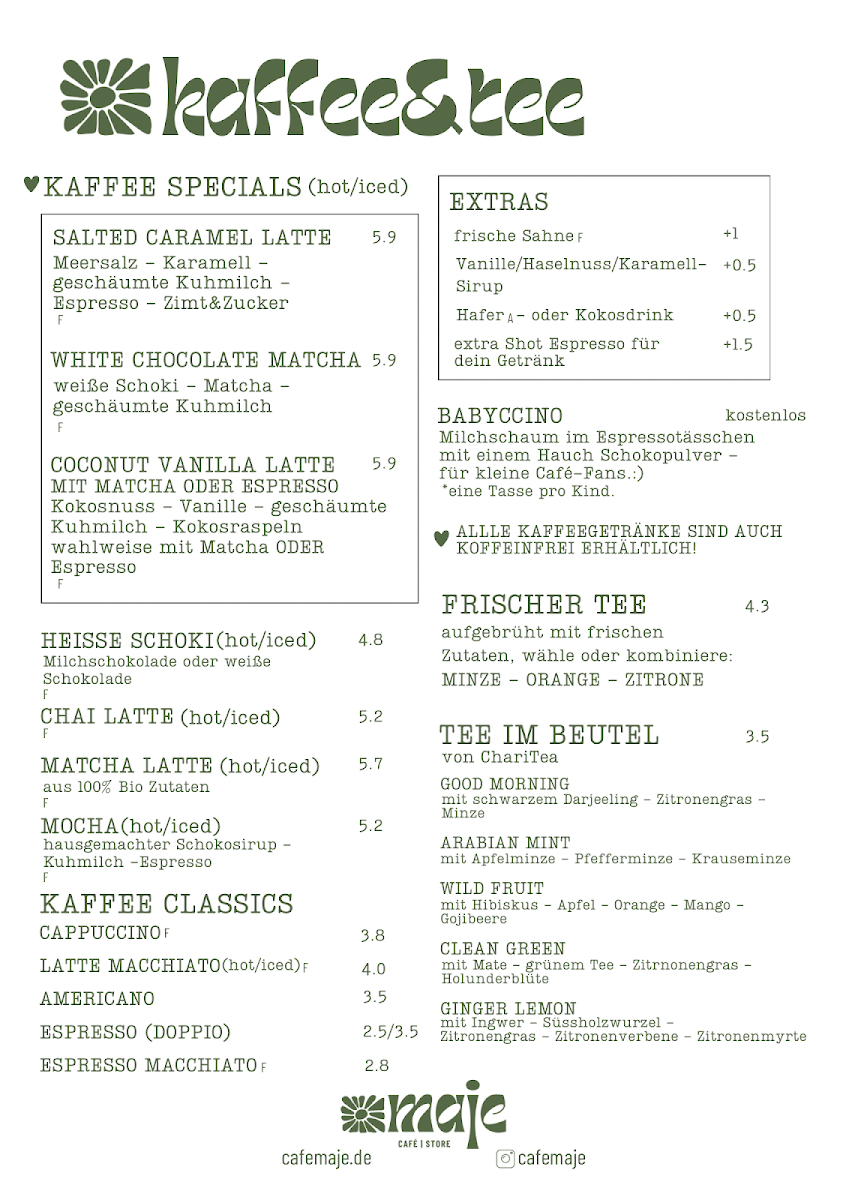 The menu at maje - café and store focuses primarily on café-style offerings suitable for various times of the day, including breakfast and light meals. Visitors can expect a selection of beverages such as coffee and specialty drinks, alongside both sweet and savory food options. The menu supports casual dining experiences, allowing guests to enjoy a relaxed meal or quick order.